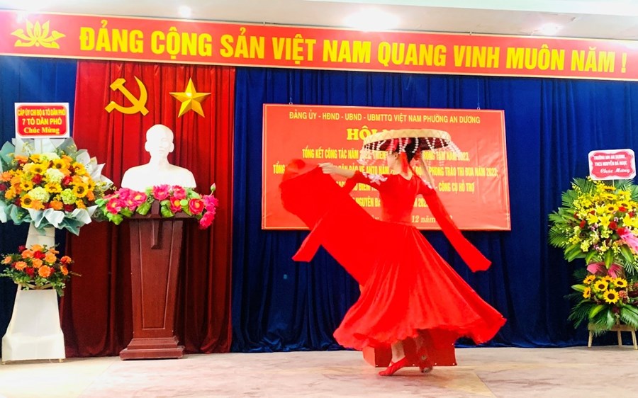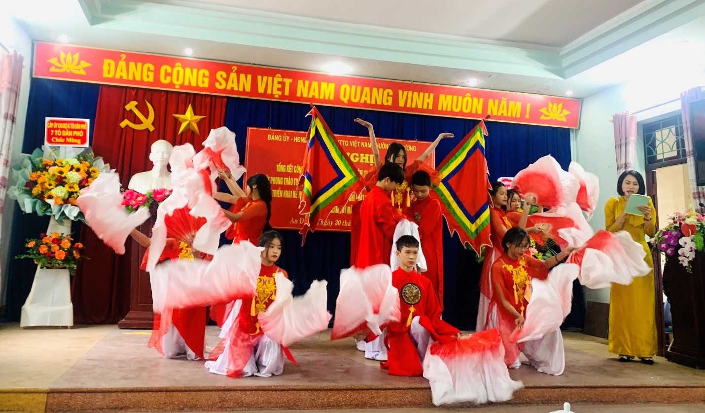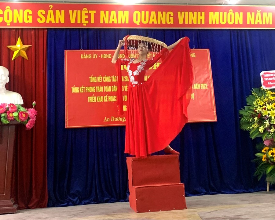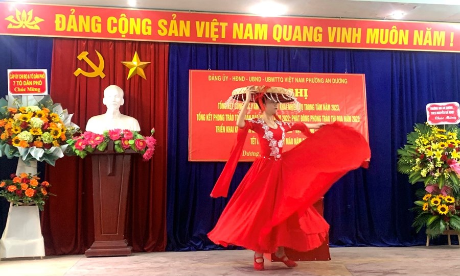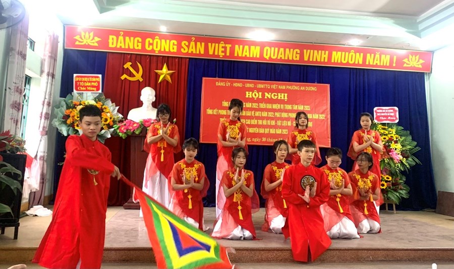 Sáng 30/12/2022, tại Hội nghị tổng kết công tác năm 2022, triển khai nhiệm vụ trọng tâm năm 2023, tổng kết phong trào toàn dân bảo vệ ANTQ năm 2022; phát động phong trào thi đua năm 2023, triển khai kế hoạch cao điểm thu hồi vũ khí – vật liệu nổ - công cụ hỗ trợ Tết Nguyên Đán Quý Mão 2023 của phường An Dương, Trường THCS Nguyễn Bá Ngọc đã vinh dự được phục vụ Hội nghị 02 tiết mục văn nghệ chào mừng ca ngợi mùa xuân, đất nước. Đó là tiết mục múa “Hương xuân” của em Đỗ Vân Anh lớp 7C6 cùng tiết mục biểu diễn tập thể “Đất nước lời ru” của các em học sinh lớp 8B9.