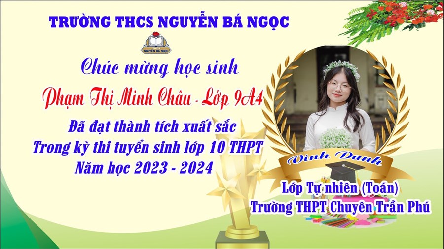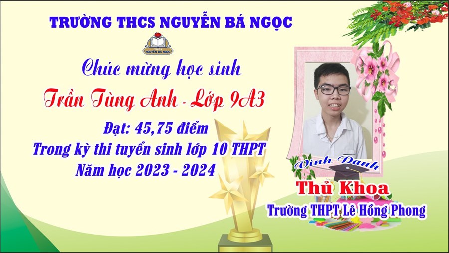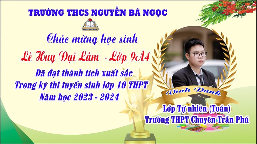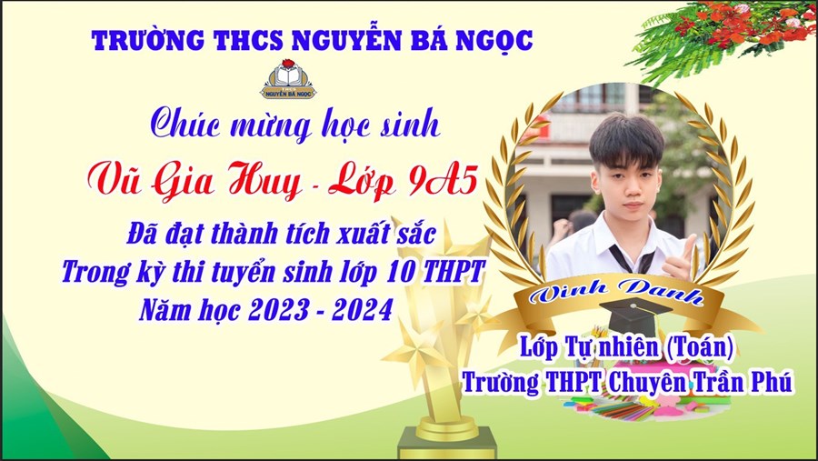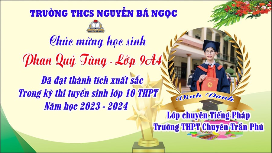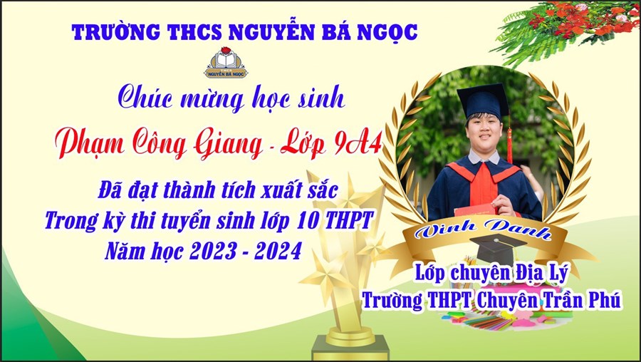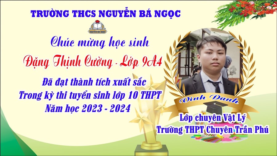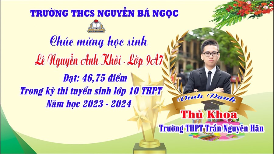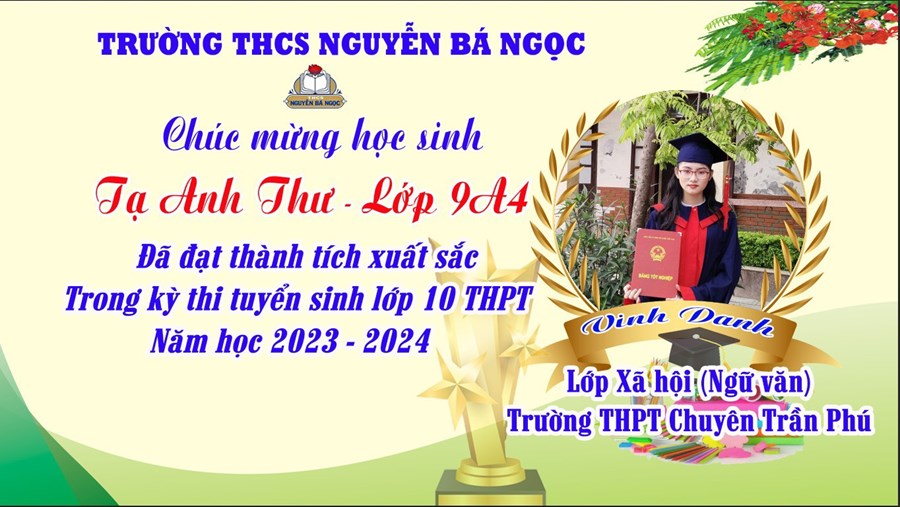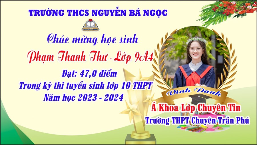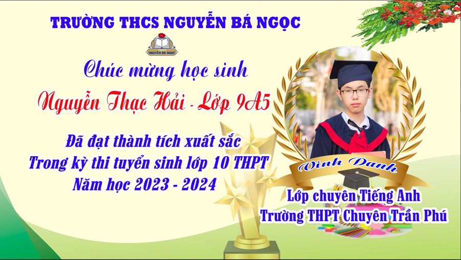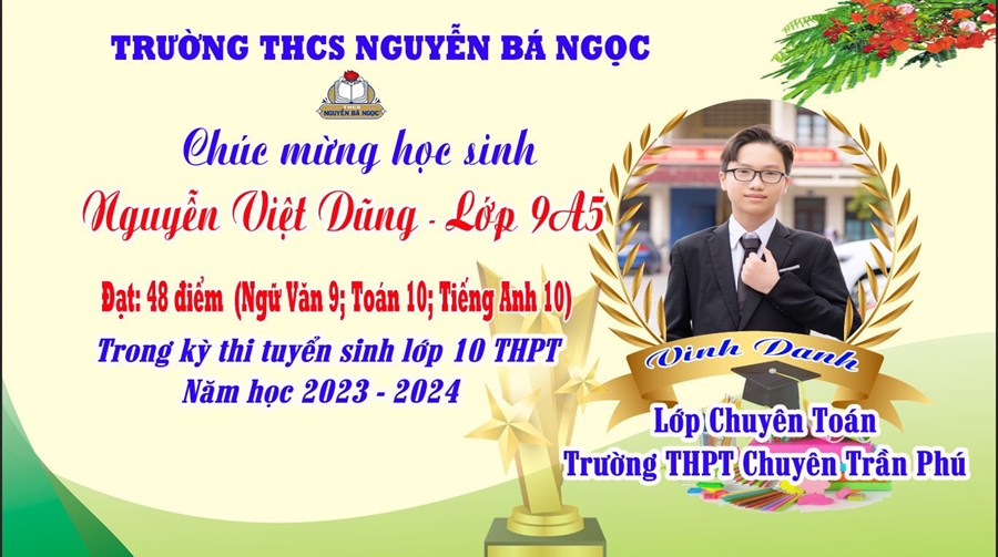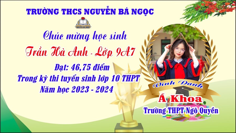 Kỳ thi vào lớp 10 THPT năm học 2023 – 2024 trường THCS Nguyễn Bá Ngọc đã đạt được những thành tích: 01 học sinh (48 điểm) cao nhất toàn thành phố; 02 thủ khoa (trường THPT Trần Nguyên Hãn và THPT Lê Hồng Phong); 02 á khoa (Chuyên Tin và THPT Ngô Quyền); 11 em đỗ trường Chuyên Trần Phú.