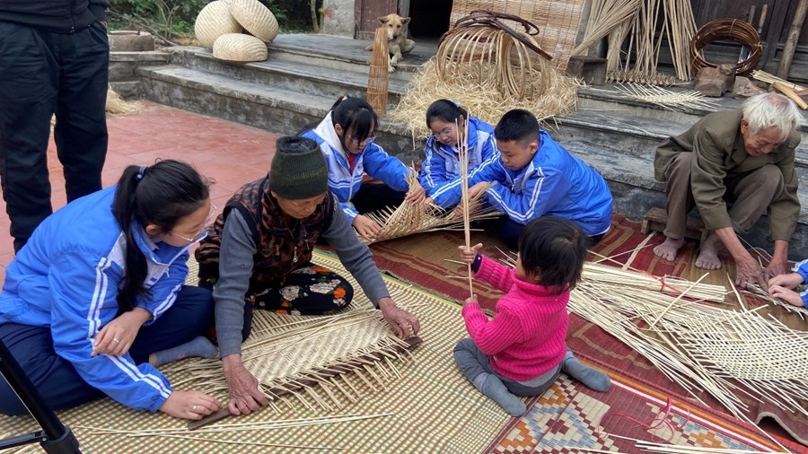 Đoàn trải nghiệm đến thăm nhà cụ Trần Văn Bảng - một căn nhà khá đơn sơ, mộc mạc, nhưng lại là nơi lưu giữ biết bao những nét đẹp truyền thống của quê hương. Cụ Trần Văn Bảng nay đã ngoài 80, là một trong những người cao tuổi nhất ở làng còn giữ nghề truyền thống.